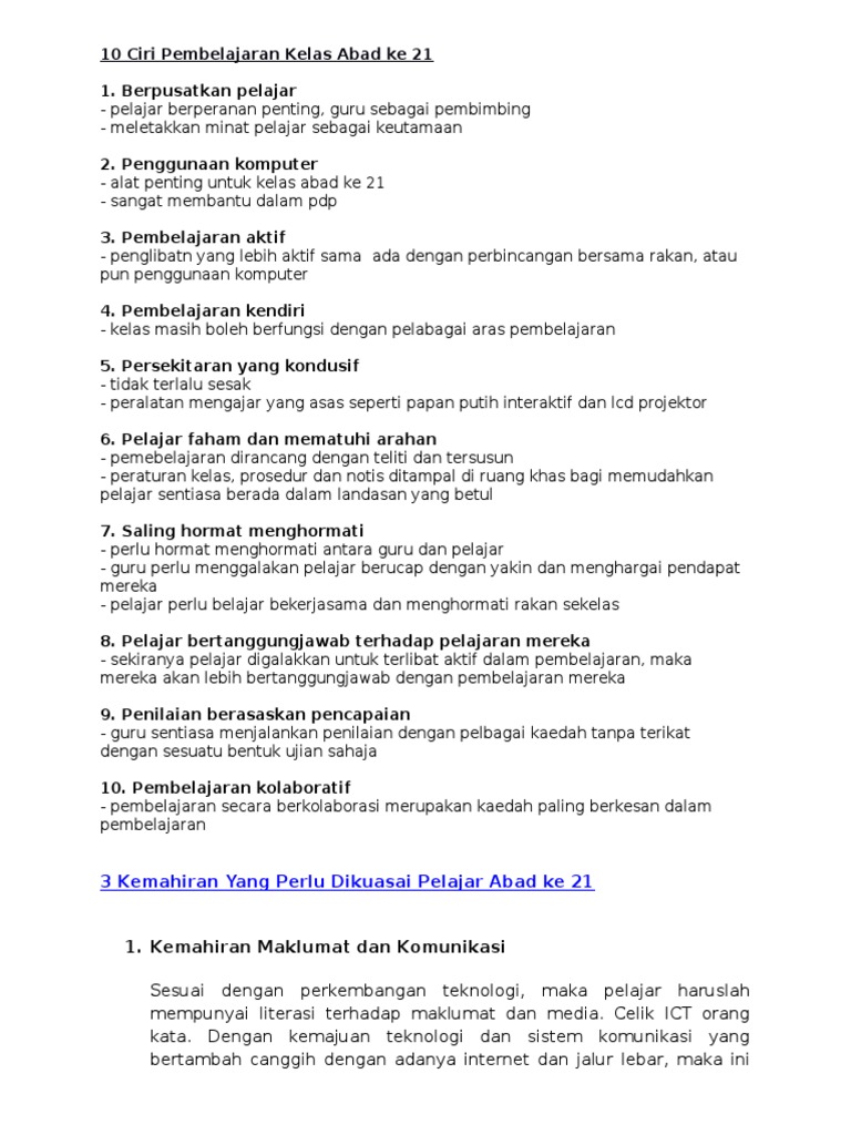 Kajian ini juga mendapati motivasi pelajar terhadap pembelajaran bahasa Dibincangkan, hanya boleh dicapai dengan gabungan beberapa sistem pembelajaran yang ada di malaysia. Keterampilan abad 21 yaitu keterampilan belajar dan berinovasi (learning and innovation skill) yang harus dimiliki manusia di abad 21 meliputi 4c keterampilan berpikir kritis, berpikir kreatif, komunikasi dan kolaborasi. Contoh kajian tindakanbahan pengajaran bahasa melayu spm: Memahami cadangan daripada guru bagi mengatasi cabaran yang mereka hadapi 4. Karakteristik abad 21 ditandai dengan Contoh aktiviti aktiviti pembelajaran abad ke 21 cikgu share teacher hacks teaching resources teaching. Kajian malaysia, journal of malaysian studies, pulau pinang: Desain penelitian ini adalah etnografi. Jadual 1 menunjukkan pernyataan sebilangan peserta untuk soalan 1. Abdur rohim (15105241053) ridho bima a (15105241011). 4.0 metodologi kajian ini menggunakan pendekatan berbentuk kualitatif. Dalam menguasai pedagogi abad ke 21, guru perlu memiliki kesediaan menggunakan teknologi maklumat dan media dalam pdp dan mengaplikasikan serta menyesuaikan dengan pedagogi serta teknik pembelajaran abad ke 21.